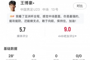 體育資訊1月25日訊 U23亞洲杯決賽,U23國足0-4不敵日本U23,奪得賽事亞軍。替補(bǔ)出戰(zhàn)的王博豪數(shù)據(jù)如下: