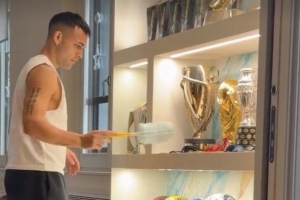 體育資訊1月25日訊 在本輪意甲聯(lián)賽主場(chǎng)大勝比薩后,國(guó)際米蘭迎來了短暫的休息時(shí)間,國(guó)米隊(duì)長(zhǎng)勞塔羅·馬丁內(nèi)斯在家中打掃了自己的獎(jiǎng)杯。