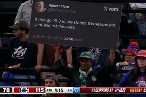 GIF-有球迷當時發(fā)推特說快船要打出15勝3負就把這條推特打印出來吃掉,這條被場邊球迷打印出來了