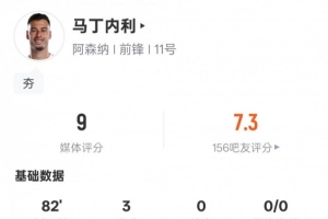 體育資訊1月11日訊 足總杯第3輪,阿森納客戰(zhàn)樸茨茅斯。馬丁內(nèi)利首發(fā)出戰(zhàn),上演帽子戲法,還有1次射中門框,2次錯(cuò)失進(jìn)球機(jī)會(huì),評(píng)分9.0。