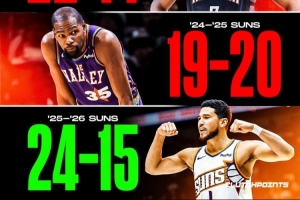 太陽(yáng)本賽季前39場(chǎng),戰(zhàn)績(jī)24勝15負(fù),暫時(shí)排名西部第6。上賽季同期,他們戰(zhàn)績(jī)是19勝20負(fù)。