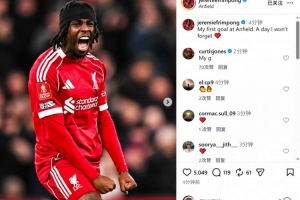 弗林蓬社媒曬出慶祝進(jìn)球的照片,配文:“我在安菲爾德的首粒進(jìn)球,我永遠(yuǎn)不會(huì)忘記的一天。”