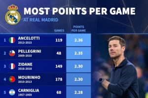 體育資訊1月13日訊 皇馬官方宣布主帥阿隆索下課,德國轉(zhuǎn)會市場統(tǒng)計(jì)了皇馬主帥的場均積分,阿隆索2.24分排名第7位。