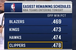 快船主場迎戰(zhàn)黃蜂,轉(zhuǎn)播方給出一項(xiàng)統(tǒng)計(jì),剩余對(duì)手勝率排名,快船第四輕松。