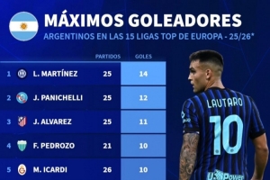 歐洲聯(lián)賽阿根廷射手榜:勞塔羅14球居首,帕尼切利、小蜘蛛前三