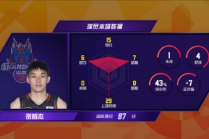 ??1月9日,常規(guī)賽第12輪,山東高速客場87-85戰(zhàn)勝北京北汽,收獲5連勝。本場比賽山東高速隊(duì)高詩巖因傷缺陣,后衛(wèi)線上珀賽爾和謝智杰站了出來,珀賽爾在最后時(shí)刻完成絕殺,謝智杰登場29分11秒,貢獻(xiàn)15分7籃板6助攻。這是謝智杰職業(yè)生涯首次打出15+5+5的表現(xiàn)。
