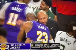 賽后,詹姆斯和現(xiàn)雄鹿助教、前湖人主教練哈姆擁抱致意。