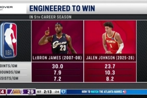 老鷹客場挑戰(zhàn)湖人,轉播方曬出杰倫·約翰遜和詹姆斯生涯第五個賽季的數(shù)據(jù)對比,老鷹官推轉發(fā)。