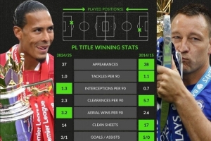英超第一中衛(wèi)?對比奪冠賽季:特里解圍、零封、進(jìn)球都比范戴克多