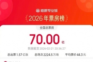 體育資訊02月21日訊 據(jù)央視新聞,網(wǎng)絡(luò)平臺數(shù)據(jù),截至2月21日20時(shí)30分,2026年年度電影總票房(含預(yù)售)突破70億!