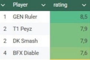 體育資訊2月22日訊 外網(wǎng)LCK AD評分:Ruler第一,Peyz和Smash第二。