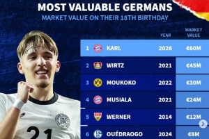 德轉(zhuǎn)列歷史18歲生日時(shí)德國球員身價(jià)榜:歐元