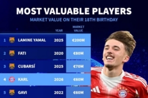 體育資訊2月23日訊 德國轉(zhuǎn)會市場列出了球員18歲生日當(dāng)天身價排名,亞馬爾2億歐居首,法蒂8000萬歐次席,庫巴西7000萬歐,卡爾6000萬歐。