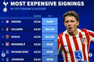 體育資訊1月15日訊 熱刺已經(jīng)官宣簽下馬競中場加拉格爾,《轉(zhuǎn)會市場》也統(tǒng)計了熱刺隊史引援榜情況,哈維·西蒙斯等4將超過6000萬歐元。