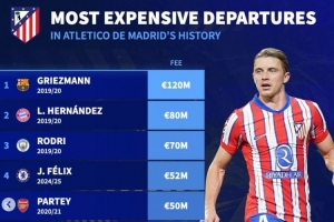 體育資訊1月15日訊 馬競已經(jīng)官宣中場加拉格爾轉(zhuǎn)會(huì)熱刺,《轉(zhuǎn)會(huì)市場》也統(tǒng)計(jì)了馬競隊(duì)史最貴賣人情況,格列茲曼仍居首。
