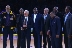 現(xiàn)場,湖人眾名宿出席儀式;萊利打趣道:“在所有來的這些人中,只有一個(gè)人向我展示了真正的尊重,那就是詹姆斯·沃西(上圖左1),他穿了西服打了領(lǐng)帶。其他的人都太隨意了,每人罰你們2000美元?!?/p>