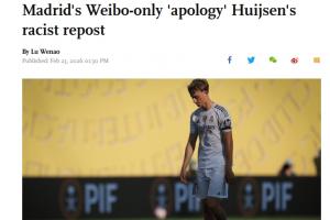 體育資訊02月23日訊 《環(huán)球時(shí)報(bào)》英文版網(wǎng)站發(fā)文報(bào)道了赫伊森轉(zhuǎn)發(fā)辱華內(nèi)容的事件,文章的標(biāo)題為《中國(guó)球迷對(duì)皇馬僅在微博發(fā)布的"道歉"表示不滿,此前赫伊森轉(zhuǎn)發(fā)種族歧視內(nèi)容》。