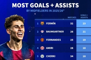 體育資訊2月24日訊 《轉(zhuǎn)會(huì)市場(chǎng)》統(tǒng)計(jì)了本賽季五大聯(lián)賽中場(chǎng)球員在各項(xiàng)賽事直接參與進(jìn)球情況,費(fèi)爾明領(lǐng)跑。