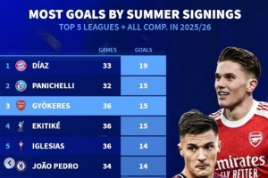 本賽季五大聯(lián)賽新援各項賽事總進球榜: