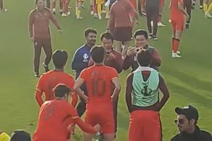 中國U23國足0-0泰國U23,實現(xiàn)U23亞洲杯歷史首次出線。賽后王鈺棟拍合影,拜合拉木趁機扒褲子,王鈺棟回頭看錯方向。