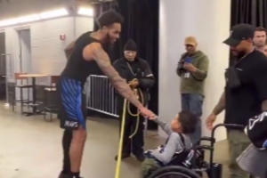 賽后,獨(dú)行俠前鋒PJ·華盛頓在球員通道處給自己的球衣簽名,并將其送給了一位殘疾的小球迷,隨后與之碰拳。