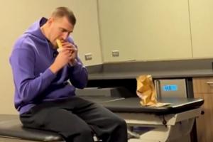 在視頻中,約基奇首先說道“因為那個(選秀廣告)我從不吃Taco Bell?!辩R頭一轉(zhuǎn),是他在更衣室悠閑品嘗卷餅一幕。