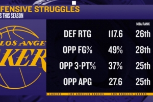 體育資訊1月17日訊 今日,ESPN總結(jié)了湖人本賽季至今糟糕的防守?cái)?shù)據(jù):