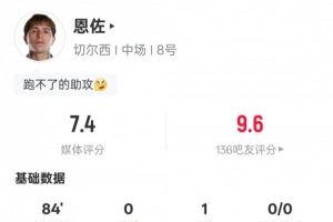 體育資訊1月18日訊 2025-26賽季英超聯(lián)賽第22輪,切爾西主場迎戰(zhàn)布倫特福德。恩佐首發(fā)出戰(zhàn),送出1次助攻,還有2次過人成功和3次關(guān)鍵傳球,評分7.4。