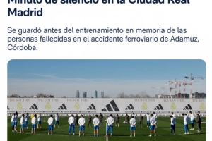 全體球員以及教練組成員在訓(xùn)練場上肅立,為近期發(fā)生在西班牙科爾多瓦省阿達穆斯地區(qū)的嚴(yán)重列車事故中的遇難者默哀一分鐘,以此表達俱樂部對逝者的深切哀悼以及對受害者家屬的慰問。