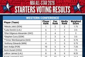 全明星首發(fā)投票詳情:西SGA媒體第1&約基奇球員第1 東CC球員第1
