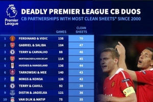 體育資訊1月20日訊 德國轉(zhuǎn)會市場統(tǒng)計了2000年以來英超中衛(wèi)組合的零封次數(shù),費(fèi)迪南德、維迪奇70場零封居首,加布里埃爾、薩利巴47場零封次席。